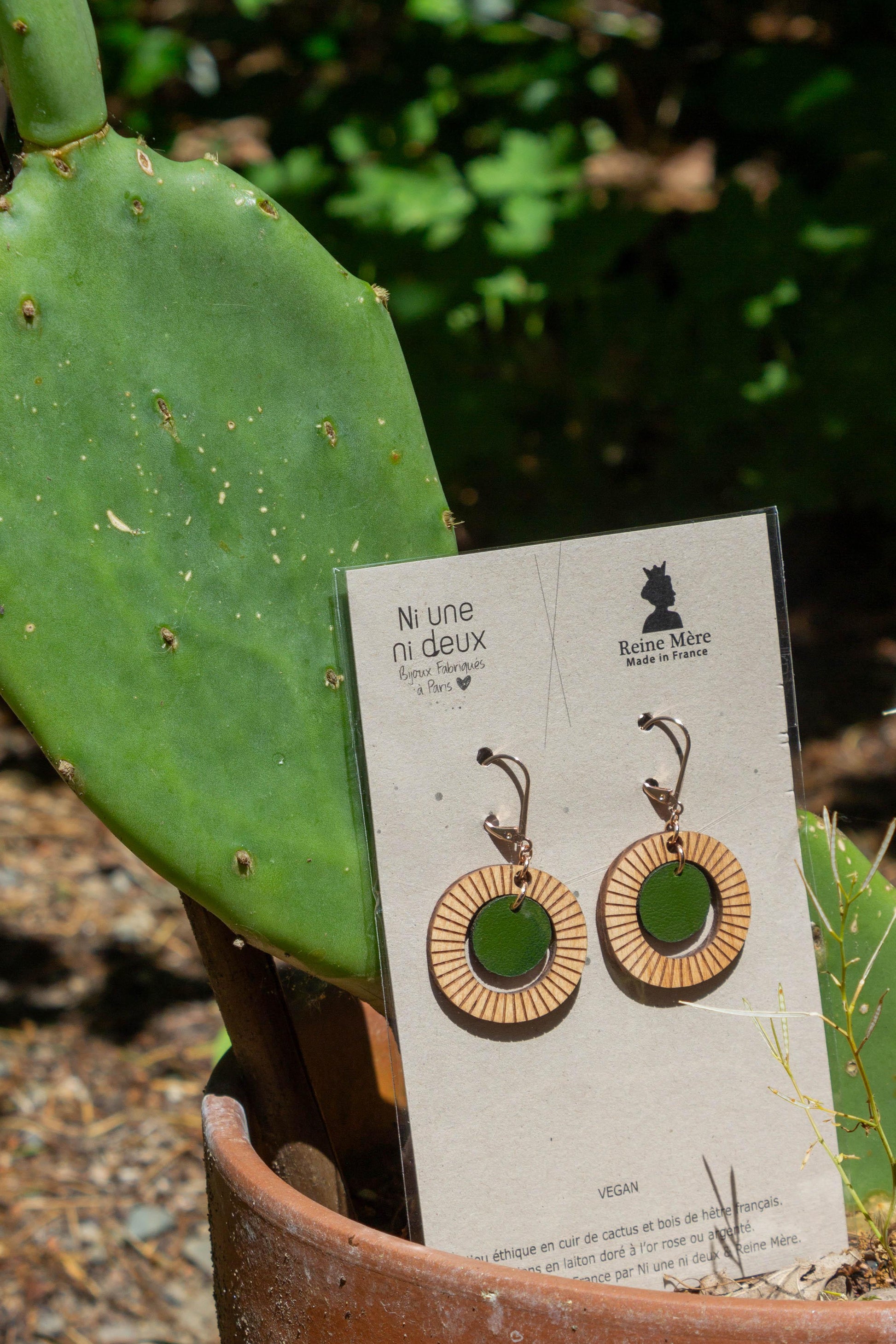 Boucles d’oreilles rondes BULLE Vert Cactus réalisé avec Ni une Ni deux en bois de hêtre et cuir vegan de cactus, conçues à Paris. Élégantes, légères et responsables, elles associent design graphique et matières durables. Fermoir dormeuse en laiton doré à l’or rose. Livrées dans une pochette cadeau éco-friendly.