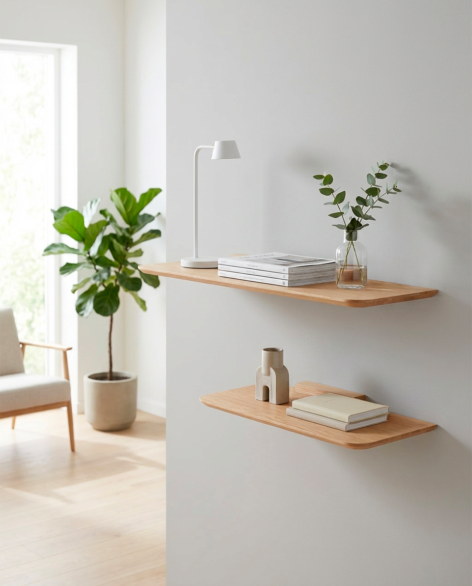 La combinaison parfaite entre style et fonctionnalité ! La tablette en plaqué chêne et le support en chêne massif confèrent un design aérien et élégant à cette étagère légère et raffinée. Vos objets de décoration seront mis en valeur avec une touche de style dans votre intérieur. Disponible en deux tailles pour s'adapter à tous les espaces.