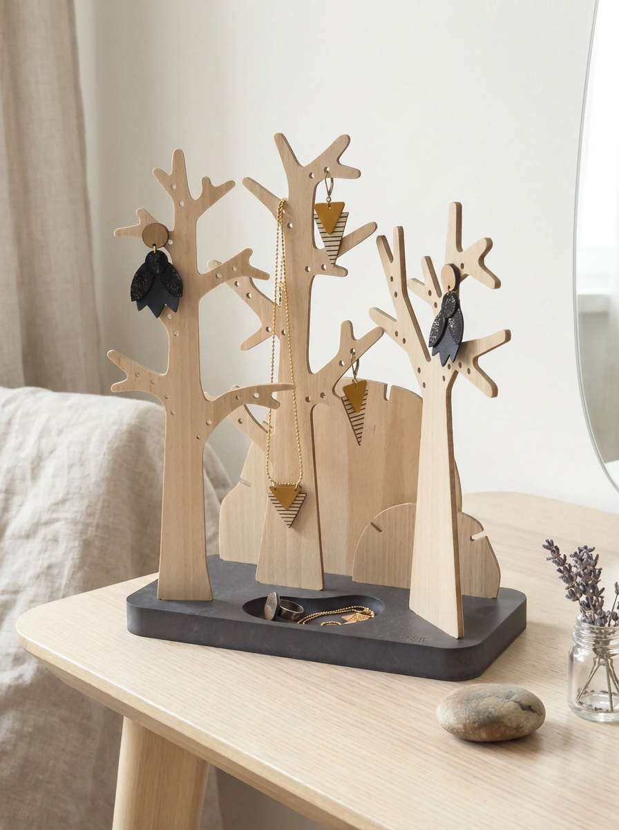 Accrochez vos colliers, bagues et bracelets et transformez votre espace en un charmant sanctuaire de beauté. La base en médium teinté de gris évoque les roches anciennes et les secrets d'une forêt magique, tandis que le placage en hêtre naturel rappelle les arbres centenaires de Brocéliande.